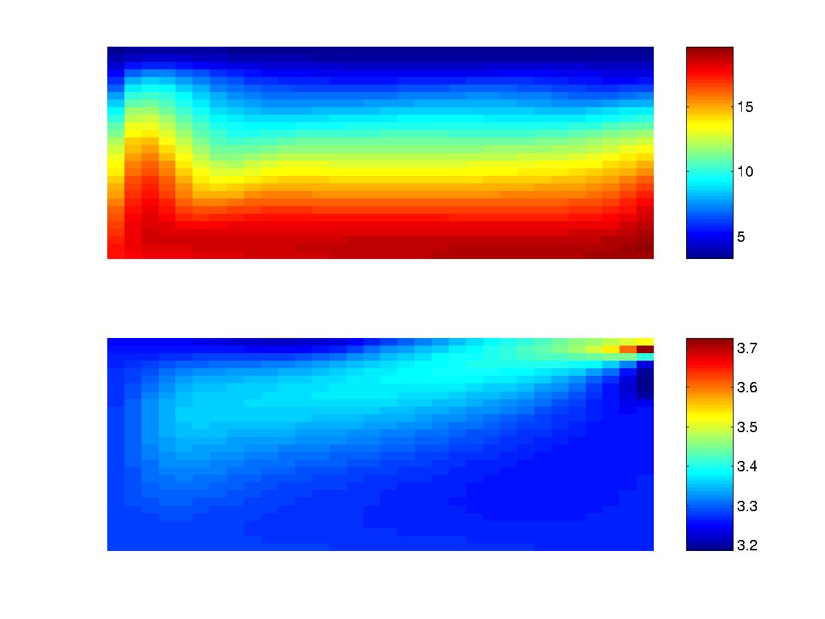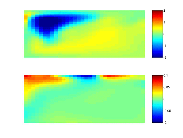 Time averaged temperature field at 75 m (upper) and 1700 m (lower) deep.